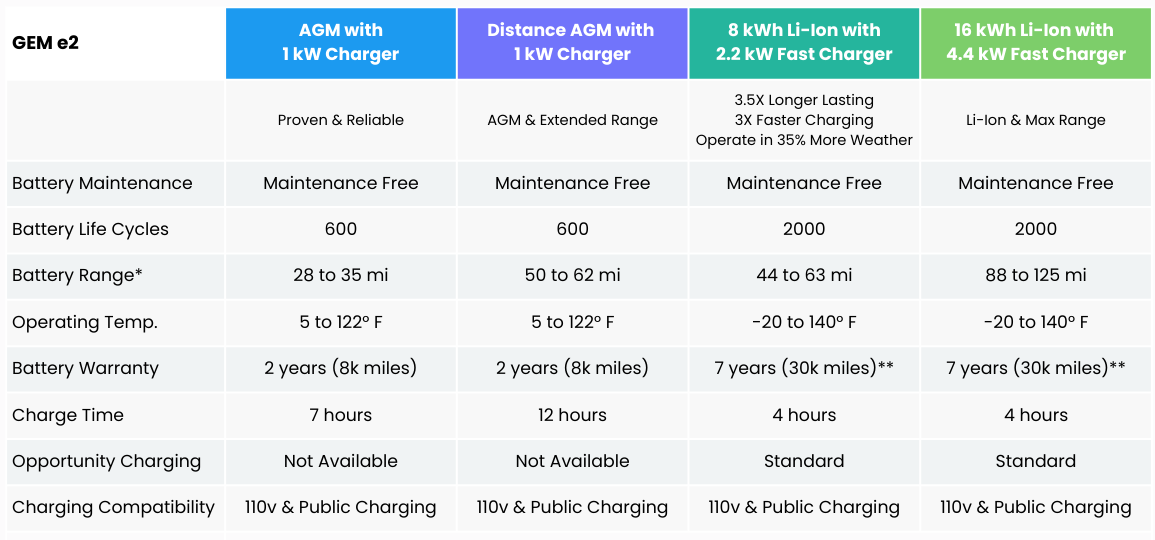 GEM is a stress-free EV to own. From our proven AGM solutions to the latest Li-Ion and fast-charging technology, GEM offers battery and charger options for any weather, charging infrastructure or budget. All GEM vehicles come standard with maintenance-free batteries for ease of ownership. And, all GEMs can charge on a standard 110v outlet or public charging station. Simply choose between AGM, Li-Ion and our extended range options.