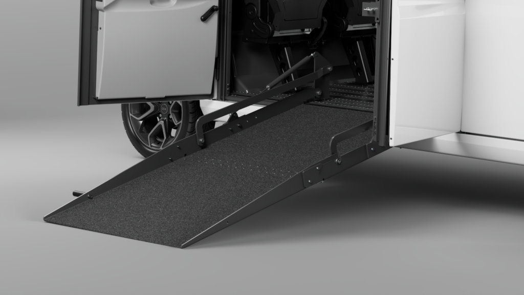 Our wheelchair-accessible EVs are equipped with a ramp to allow easy access for wheelchair users. The ramp is located at the side of the vehicle. Once inside, the wheelchair can be securely anchored using restraint systems.